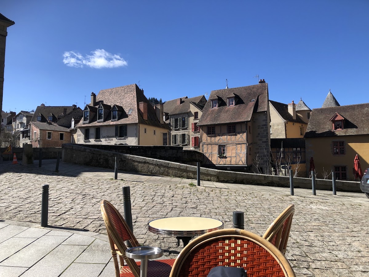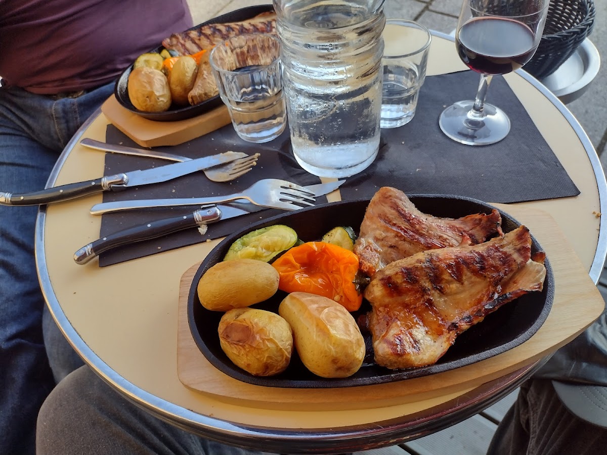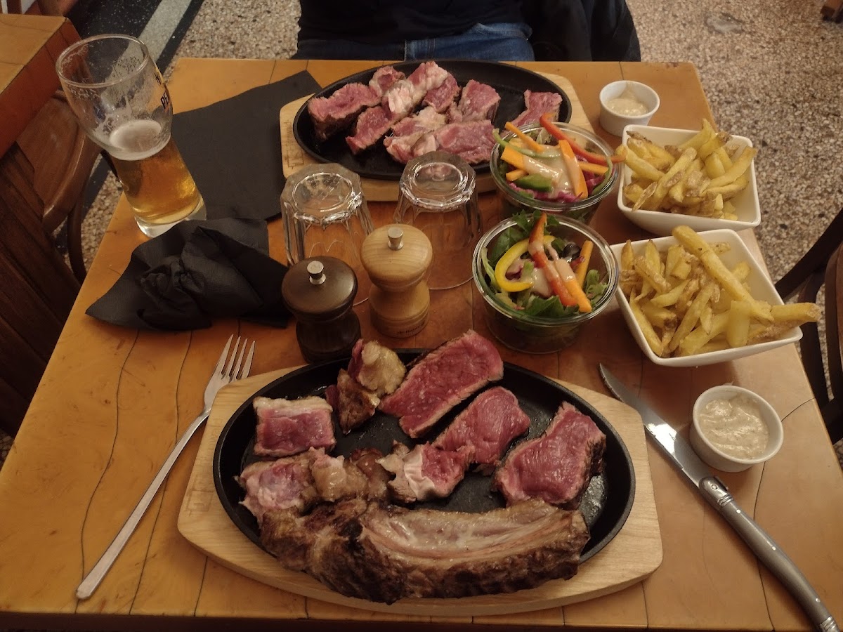I have a second home about 30 minutes drive from Aubusson. I decided to make a day trip to the tapestry museum and have lunch locally. I booked a table online for a Thursday lunchtime at 1pm. Well advised it was busy. Service was great, fast and friendly. Lovely warm atmosphere with people talking and retro 80’s pop music in the background, not intrusive at all. We both opted for the steak served medium. We had a glass of wine each and two espressos to finish off. Couldn’t manage a dessert after the huge entrecôte. We had a mushroom sauce and a chimichurra sauce with the steaks. It comes with frites and a side salad. The steak was delicious. I’d definitely recommend this place and will go back. Total bill was €49. The town was lovely to wander around and the museum of tapestry was great too.